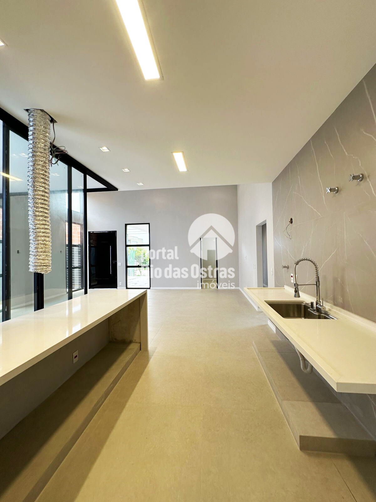 Casa linear de alto padrão composta por 3 suítes, sendo uma com closet, escritório, sala com pé direito alto, cozinha integrada, piscina com cascata e cromoterapia, lavanderia, lavabo, área livre externa, e vaga de garagem para 2 carros.